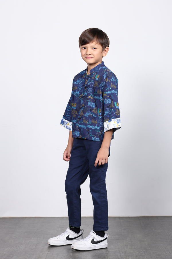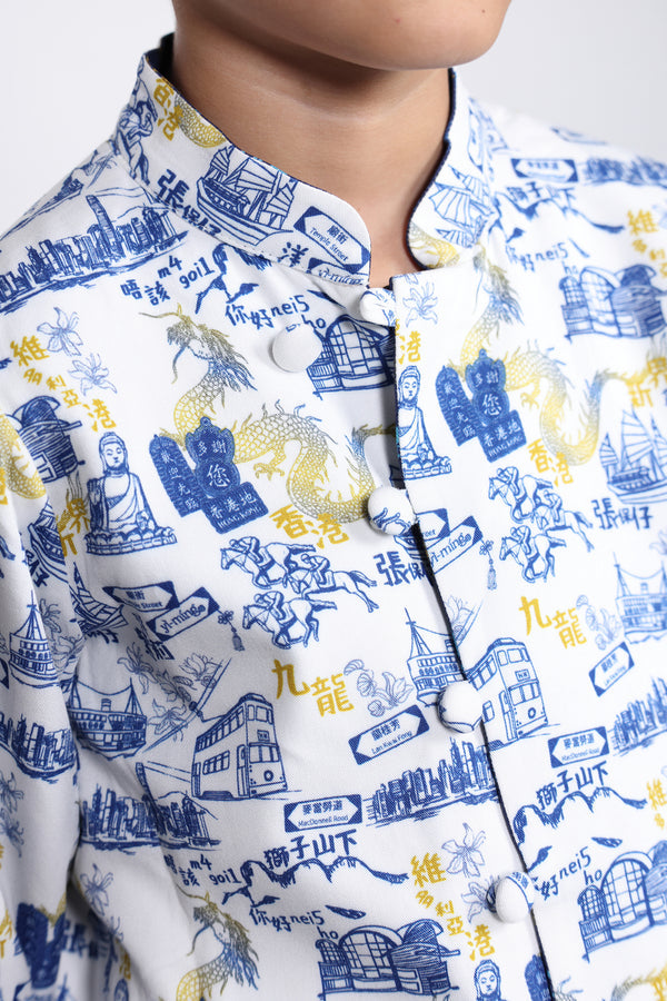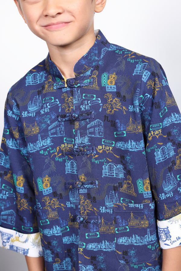Introducing the kids' reversible oriental jacket, featuring the brand's original prints of iconic Hong Kong landmarks on both sides. The jacket is reversible, offering two different stylish looks. It has a center front opening with traditional Chinese knot buttons. Available in girly fuchsia and chic navy, this jacket pairs perfectly with other styles from the Urban Elegance Collection for a family look.